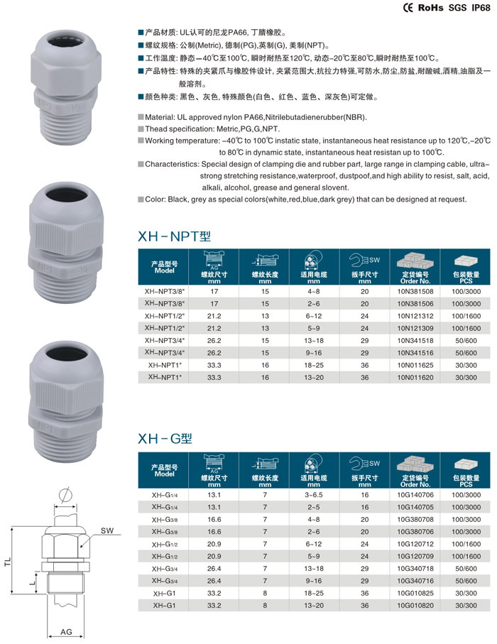 产品材质:UL认可的尼龙PA66,丁腈橡胶